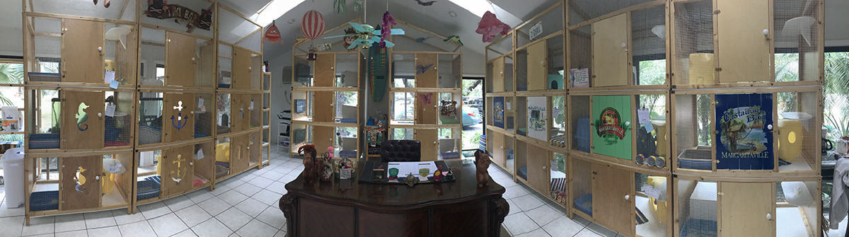 All units have floor to ceiling glass windows overlooking lush tropical gardens with birdbaths, bird feeders and fountains. Perfect for lizard, bird and squirrel watching. We also have suites with their own fish tank or TV if that’s what your pet desires. Quite entertaining!!! And soft soothing music plays in the background. Your pet will return from his stay relaxed and renewed. See our newly designed accomodations at the bottom of the page.